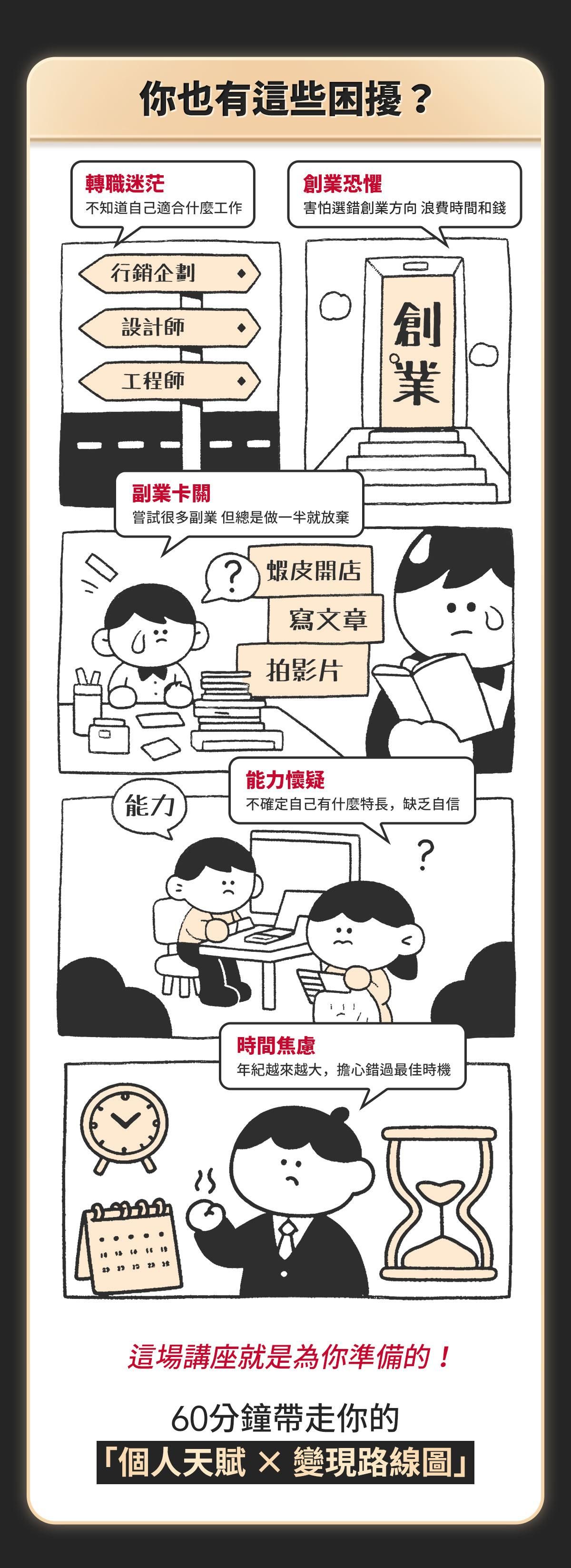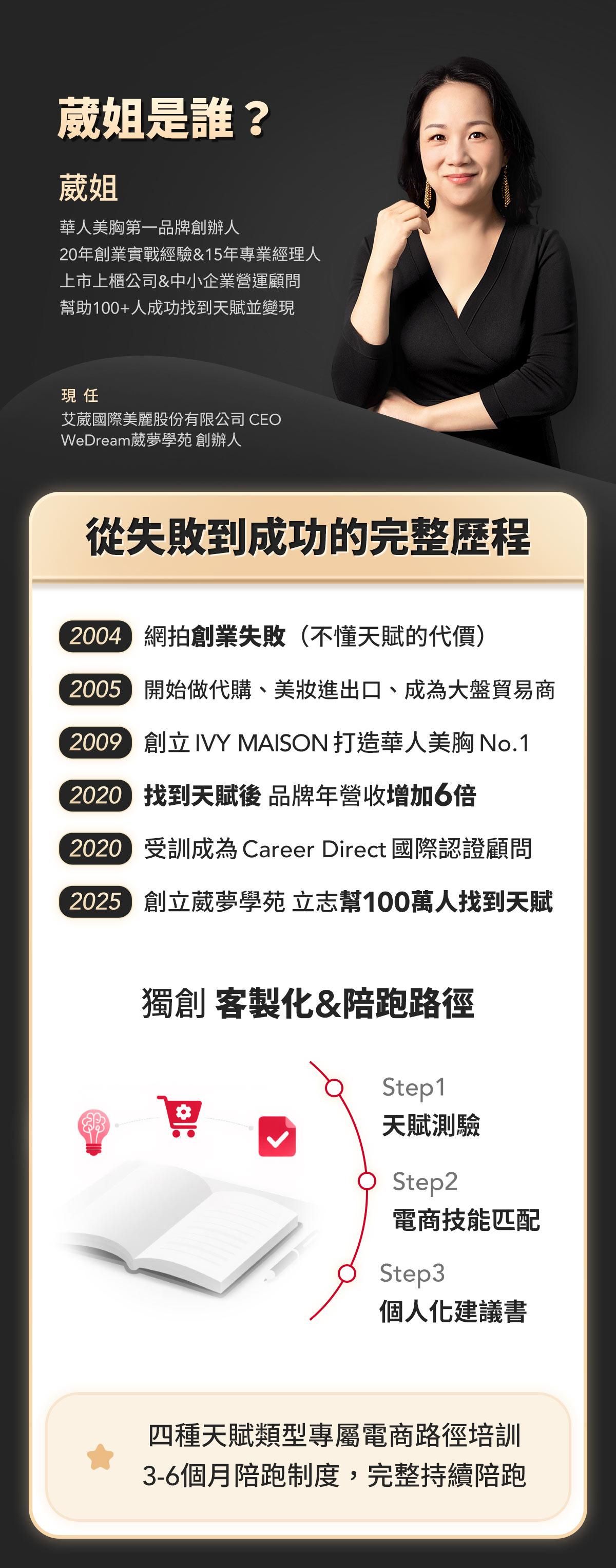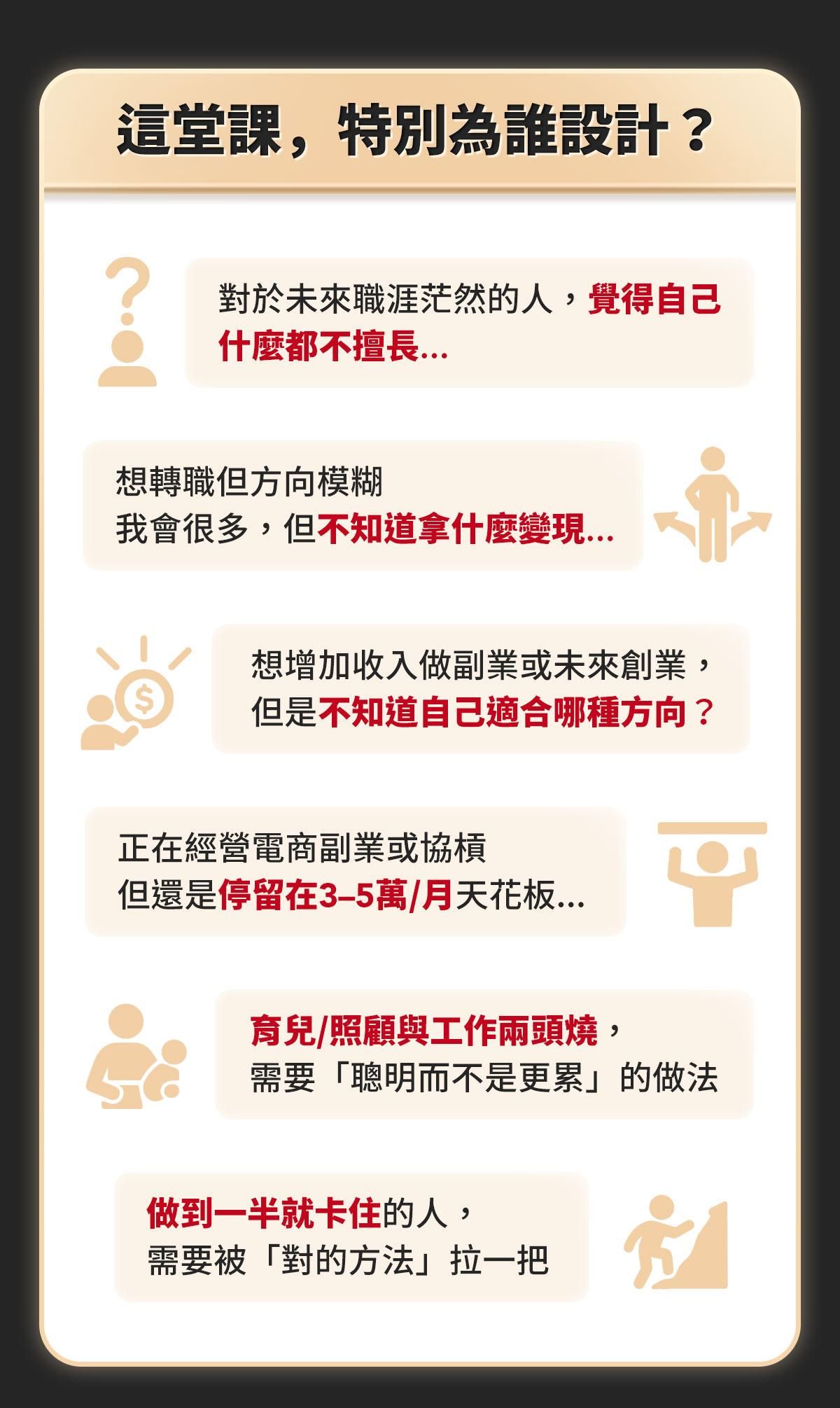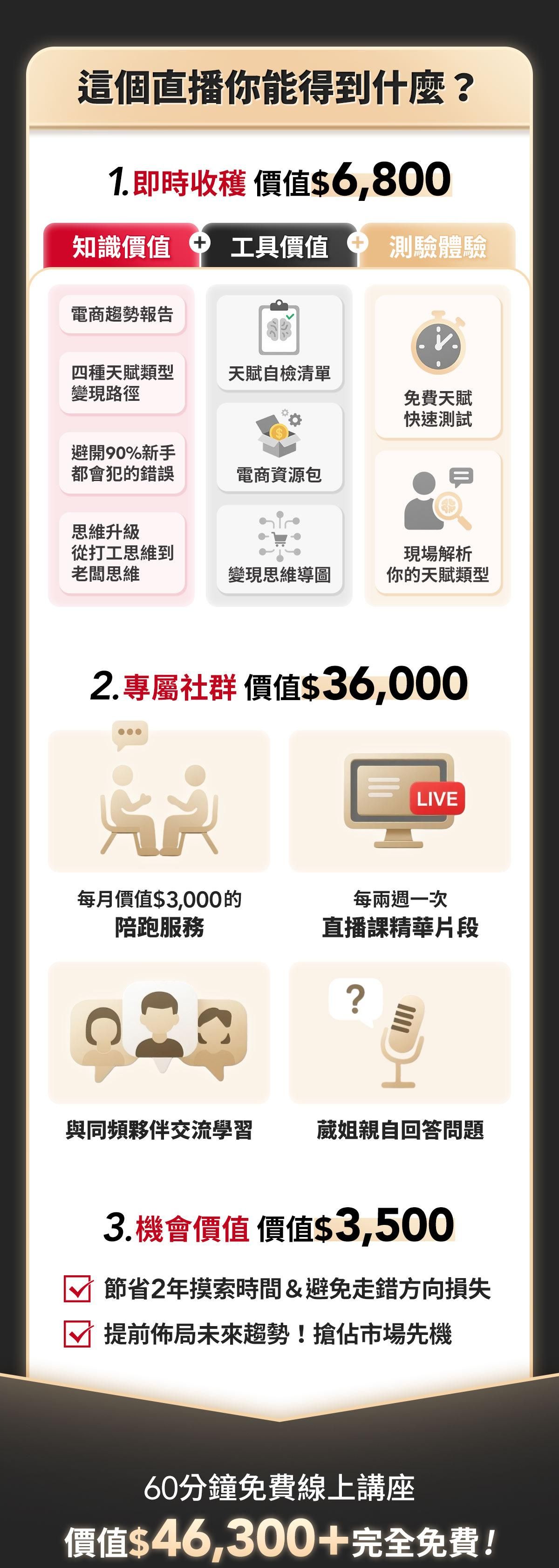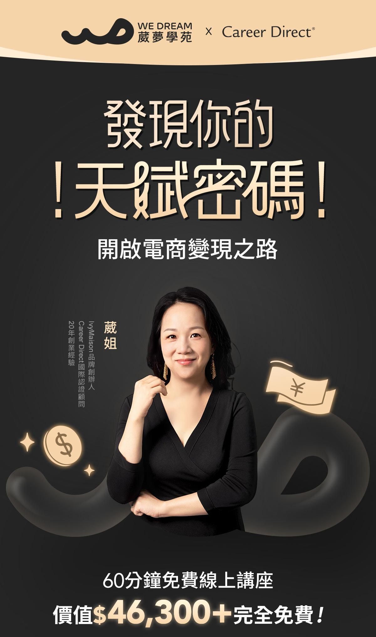 在這場分享會中,你將學會如何挖掘自己的天賦優勢,並搭配最適合的電商模式,把興趣與能力變成收入。別再盲目嘗試,來聽葳姐,葳姐將在分享會中揭露: